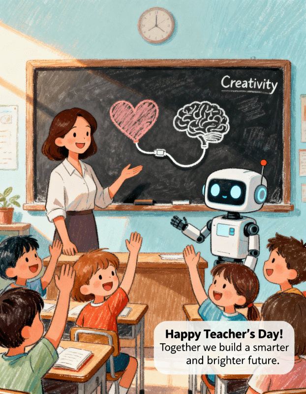 Един ден, в същата класна стая, влезе нов герой – не от плът и кръв, а от данни и алгоритми. Изкуствен интелект. Децата го харесаха. Но най-важното – учителят не се уплаши. Напротив, усмихна се и каза: „Добре дошъл! Имаме още повече да научим заедно.“