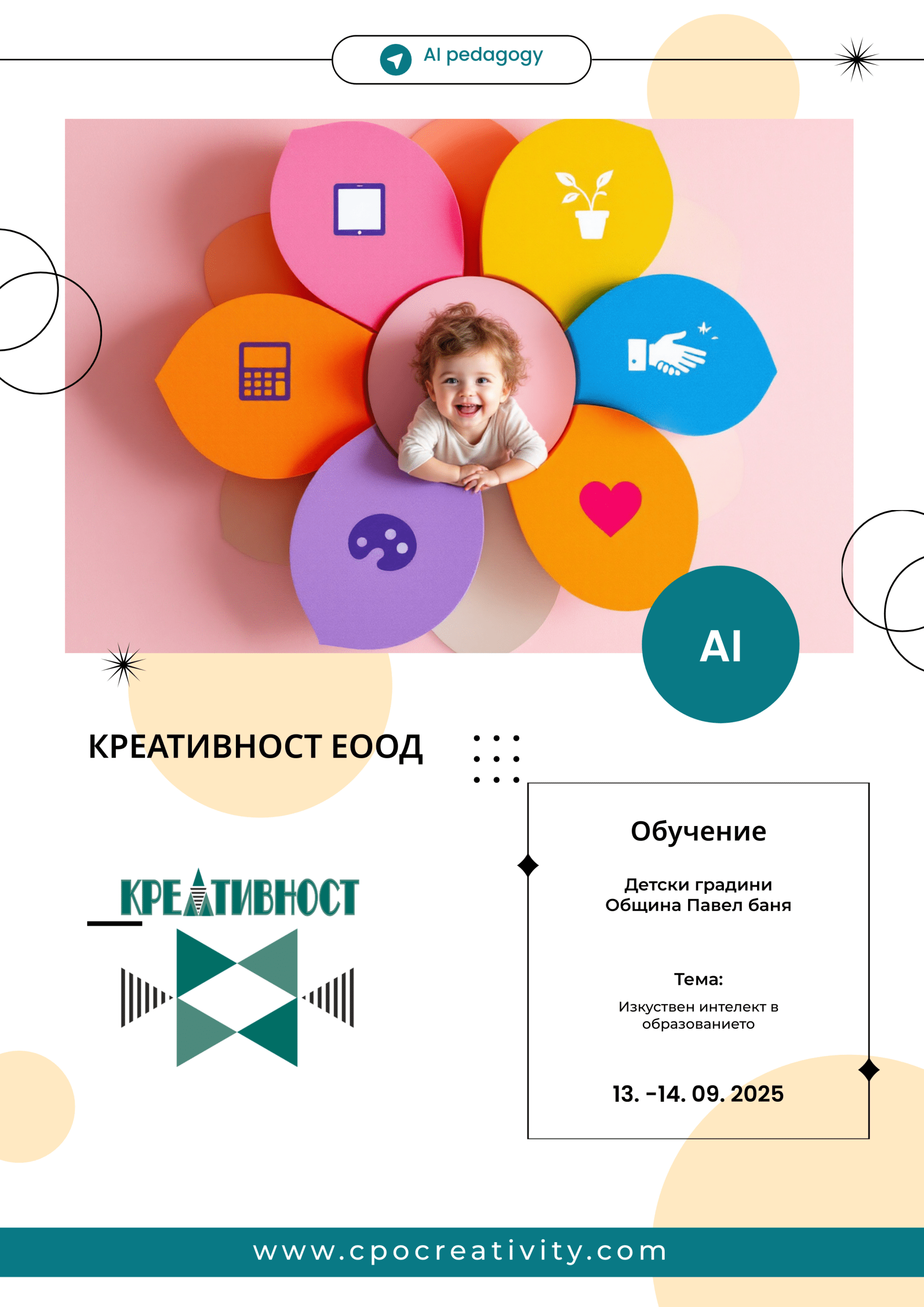 Обучение: Изкуствен интелект в образованието — Детски градини | Креативност ЕООДTL;DR: Обучението показва как детските градини могат да използват изкуствен интелект, за да улеснят ежедневната работа, да създават по-ангажиращи игри и педагогически ситуации, и да намалят времето за документи. Участниците получават готови ресурси, практически примери и ясен път за безопасно и ефективно внедряване на ИИ в учебната среда.