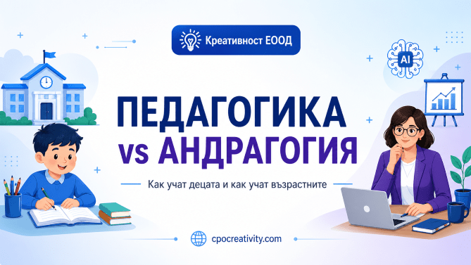Ключови теми: педагогика срещу андрагогия, андрагогия, обучение на възрастни, квалификация на учители, фирмени обучения, AI обучения, изкуствен интелект в образованието, Креативност ЕООД, професионално обучение, учене през целия живот.
