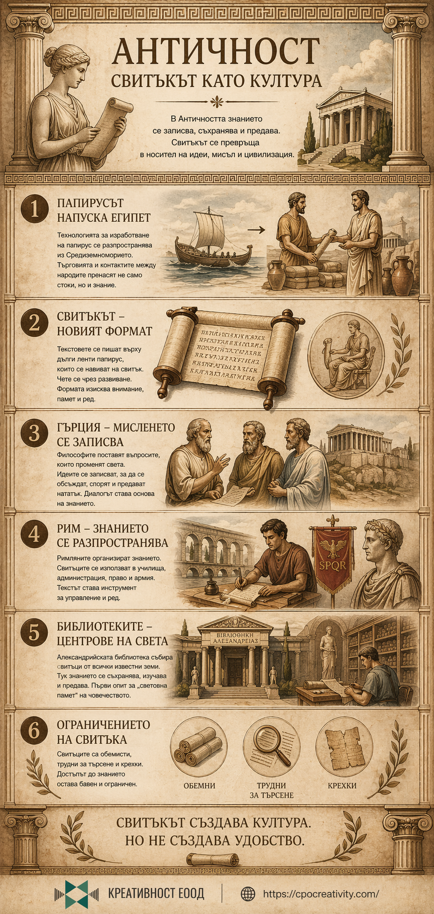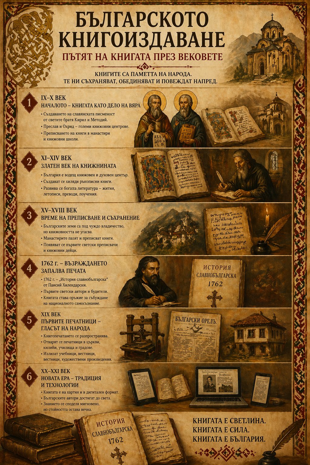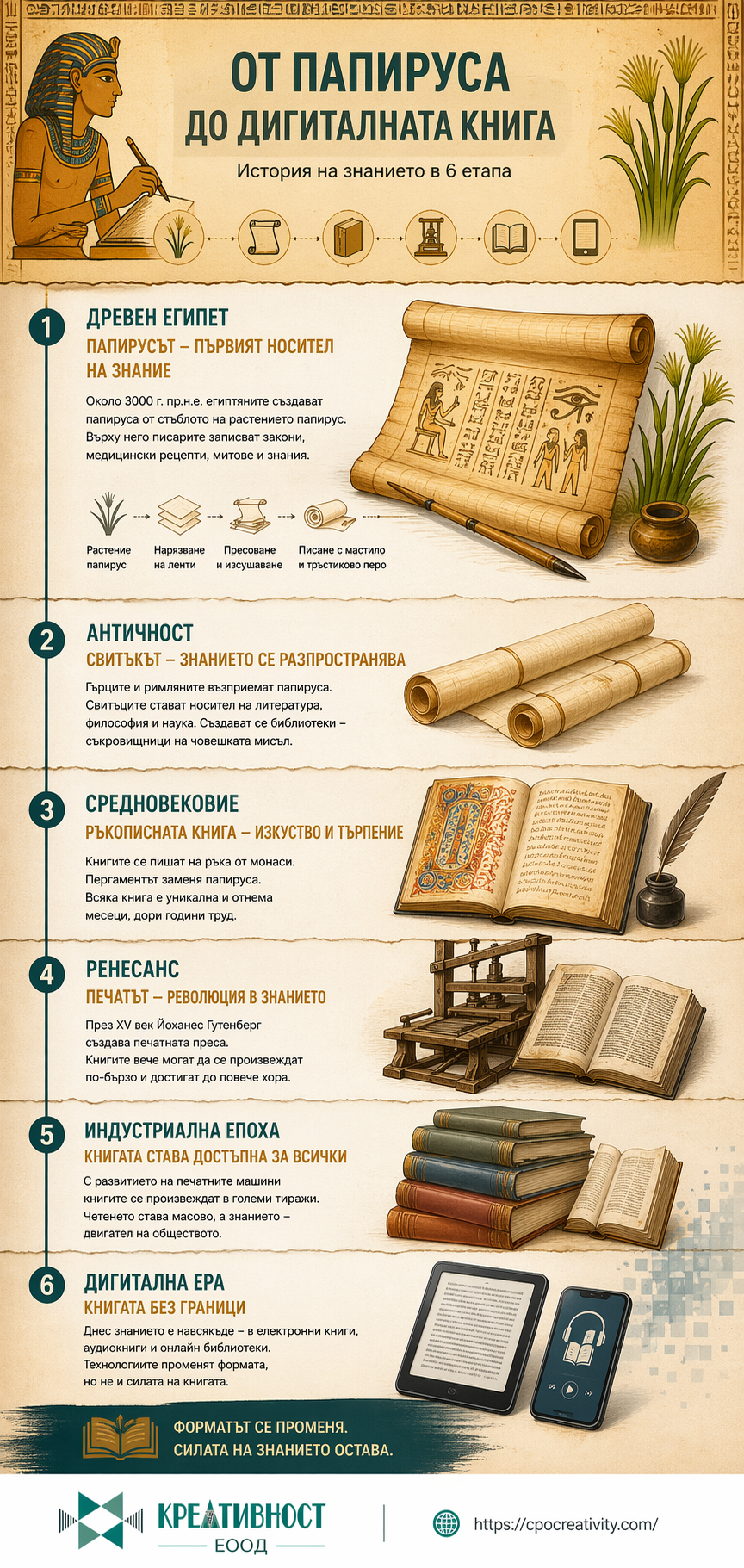Какво показва тази серия инфографики?Тя проследява развитието на книгата от древните форми до дигиталната ера и българското книгоиздаване.