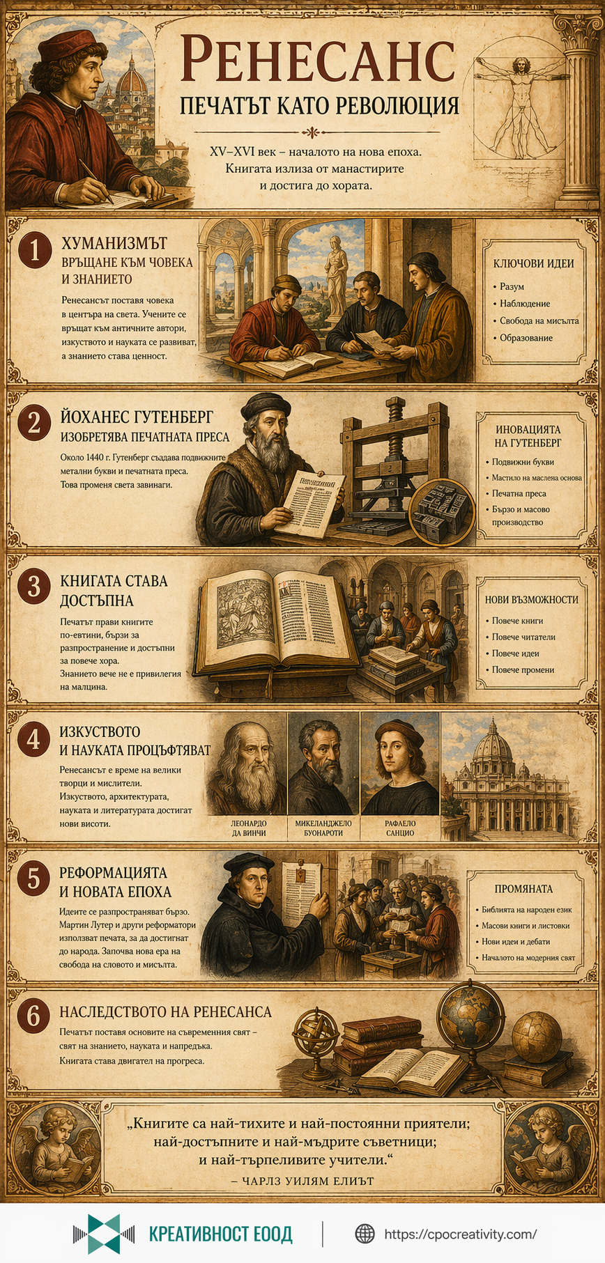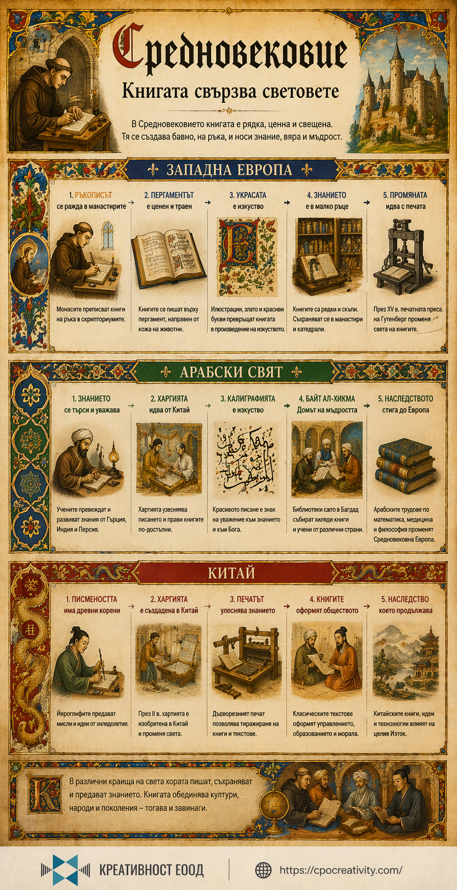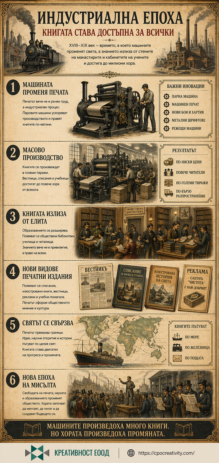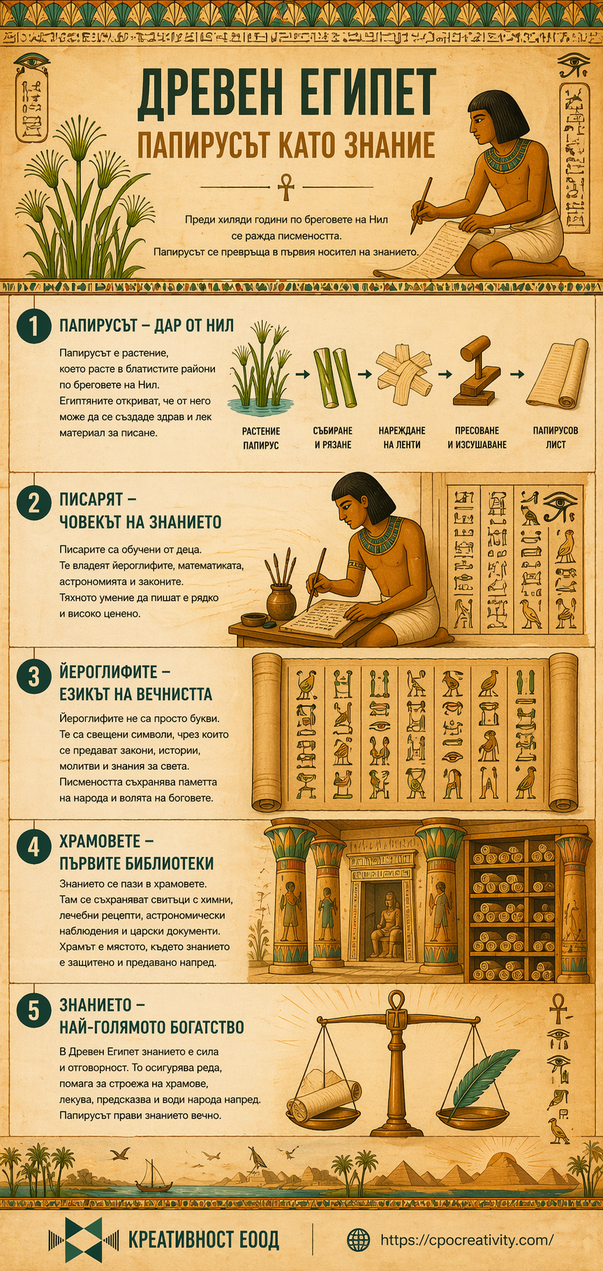 Какво показва тази серия инфографики?Тя проследява развитието на книгата от древните форми до дигиталната ера и българското книгоиздаване.
