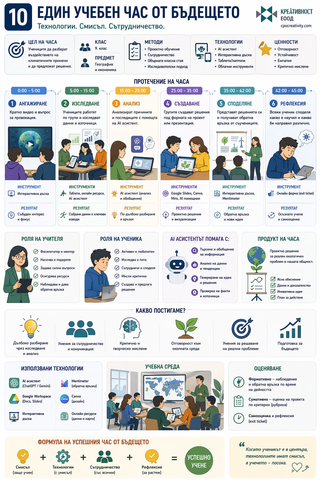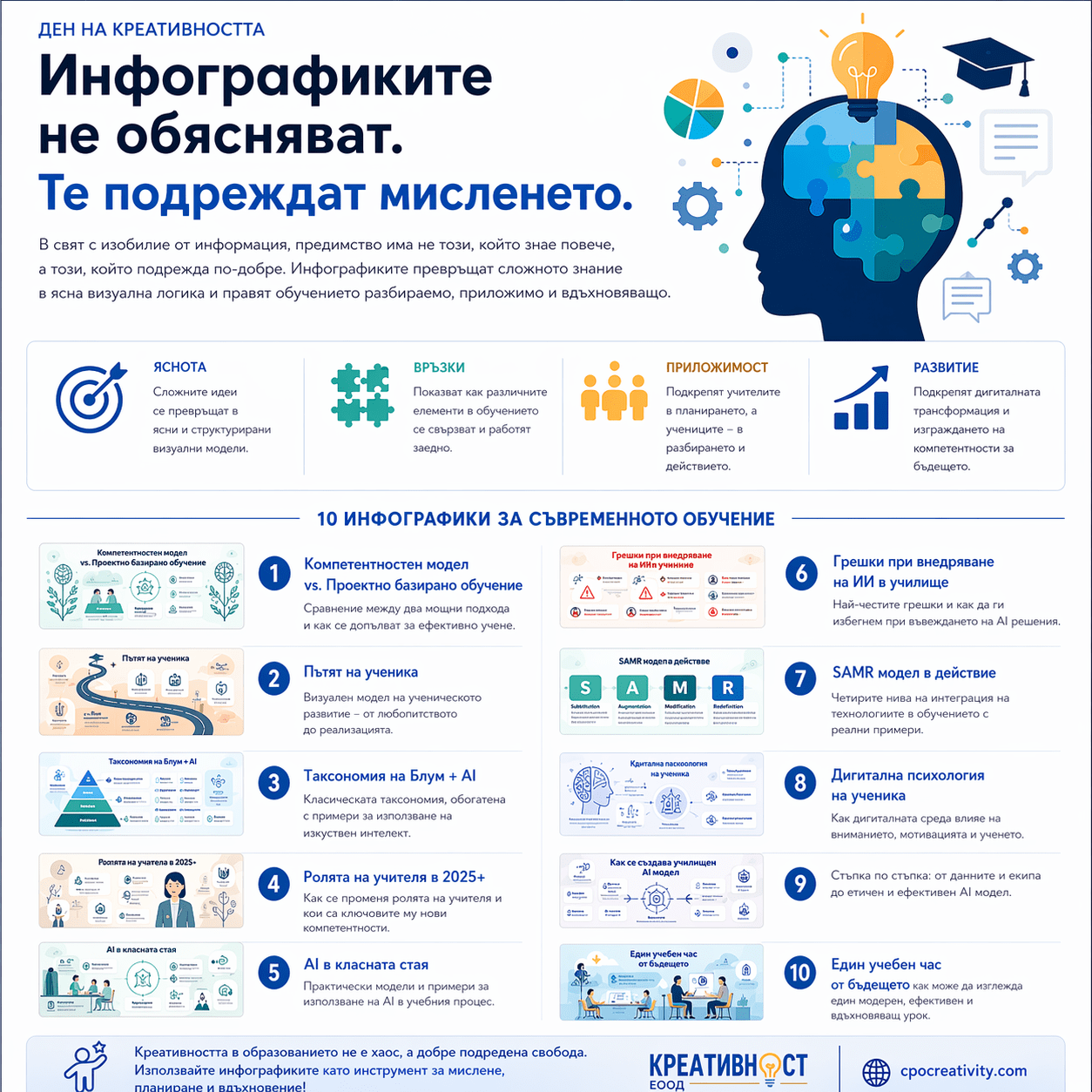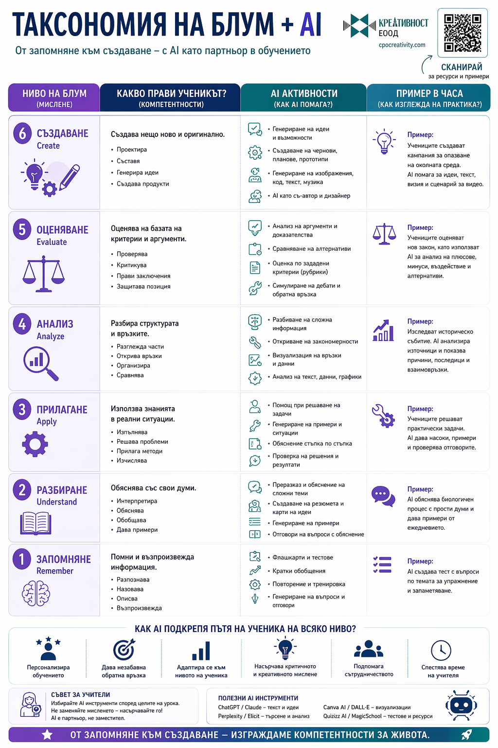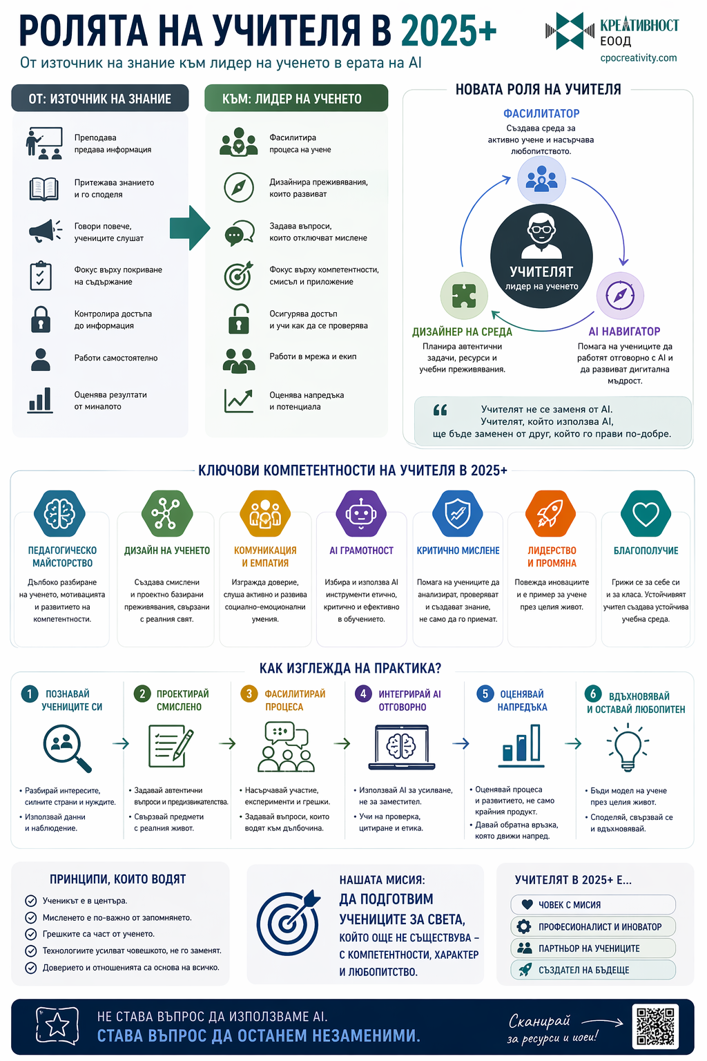 Тези инфографики не обясняват отделни теми, а изграждат цялостна система за мислене в образованието. Те свързват компетентности, методи на преподаване, изкуствен интелект и реални практики в училище. Това ги прави приложими както за учители, така и за директори и обучителни екипи.