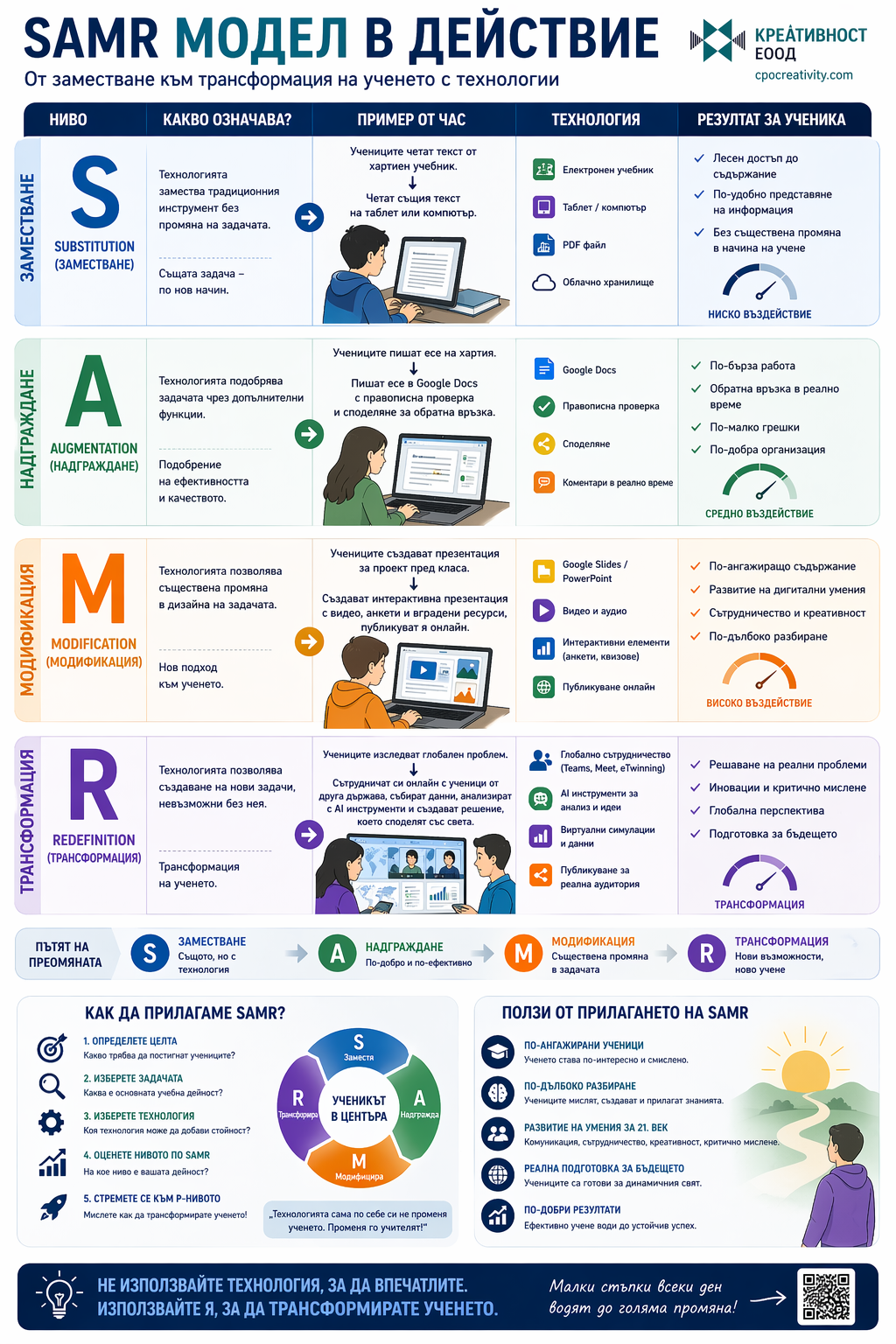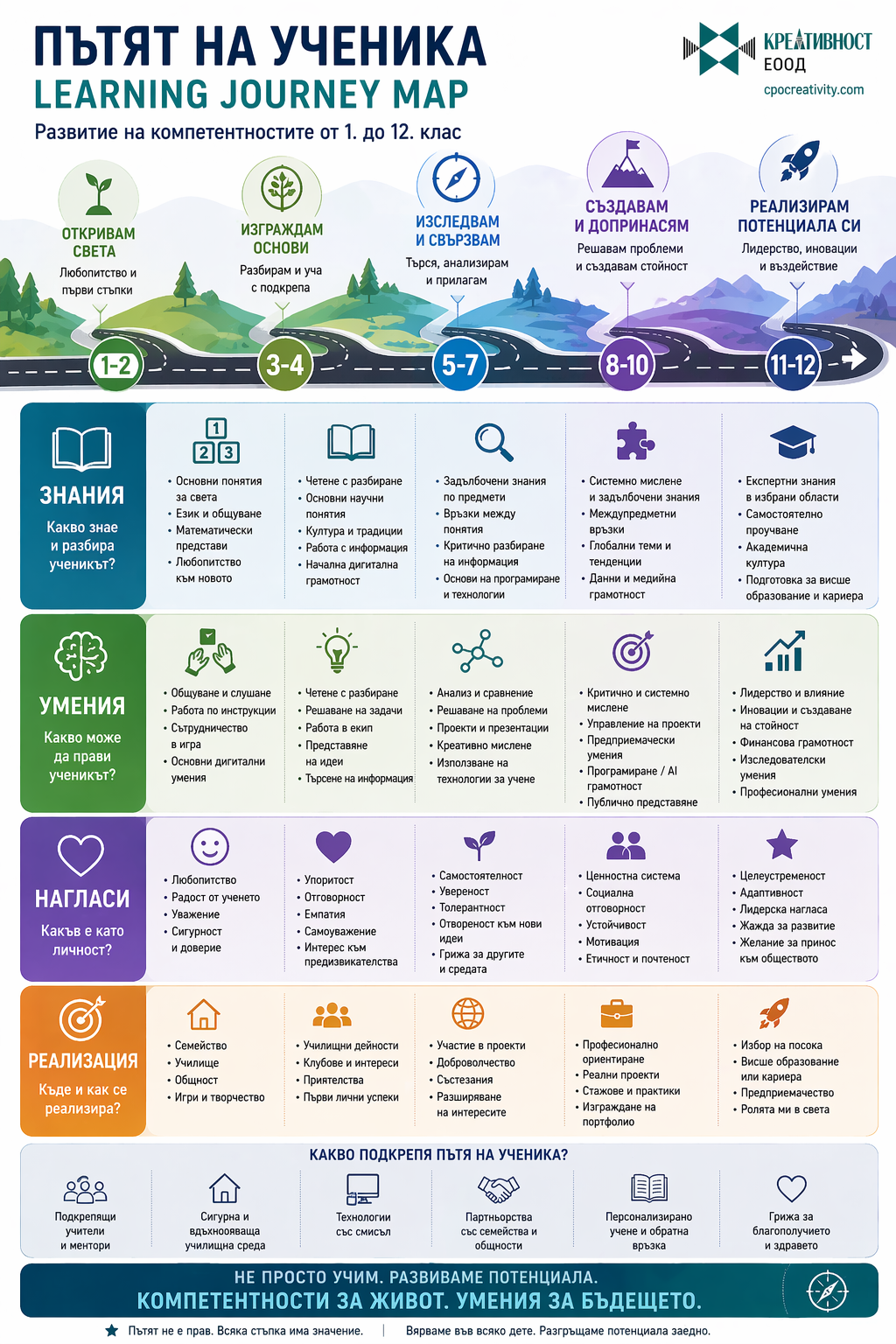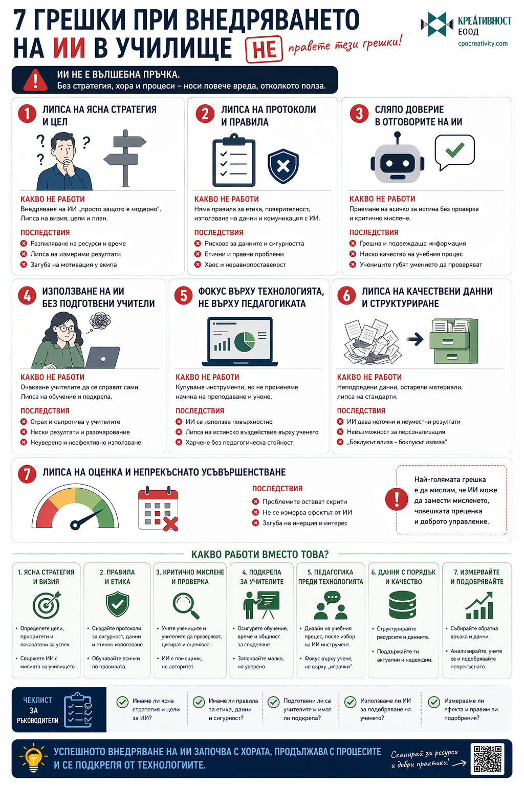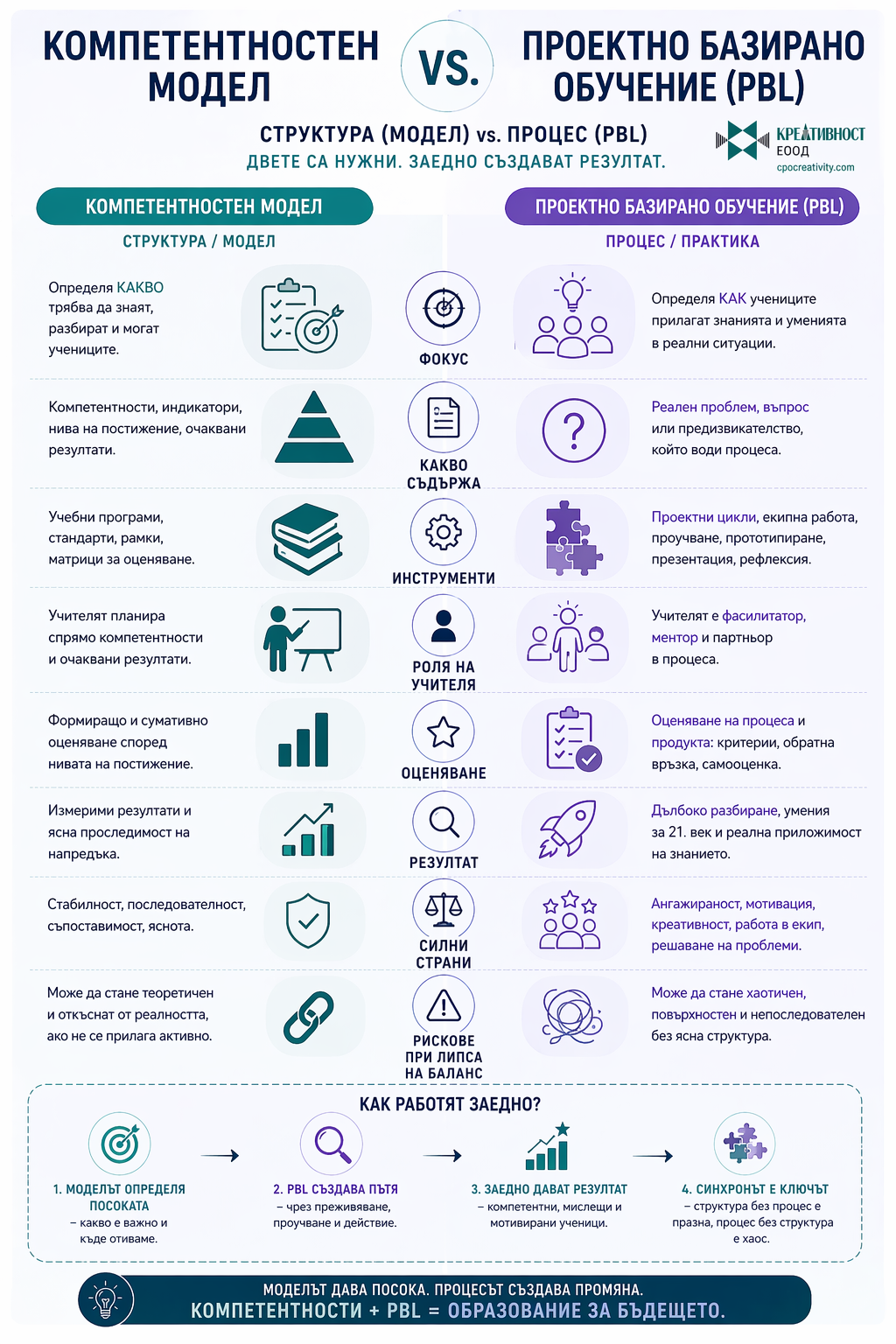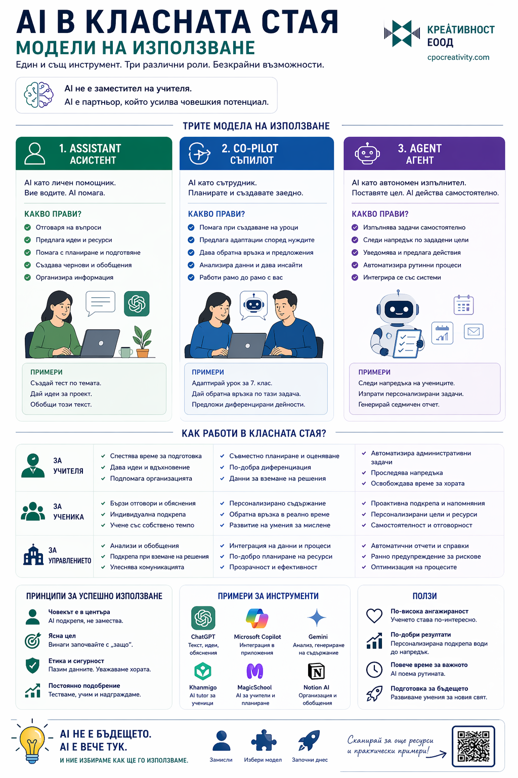 Тези инфографики не обясняват отделни теми, а изграждат цялостна система за мислене в образованието. Те свързват компетентности, методи на преподаване, изкуствен интелект и реални практики в училище. Това ги прави приложими както за учители, така и за директори и обучителни екипи.