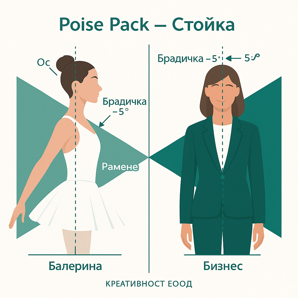 Надписи (BG/EN, по избор): „Балетен сигнал → Бизнес резултат“, „From Studio to Boardroom“, „Poise Pack: Before / After“.
