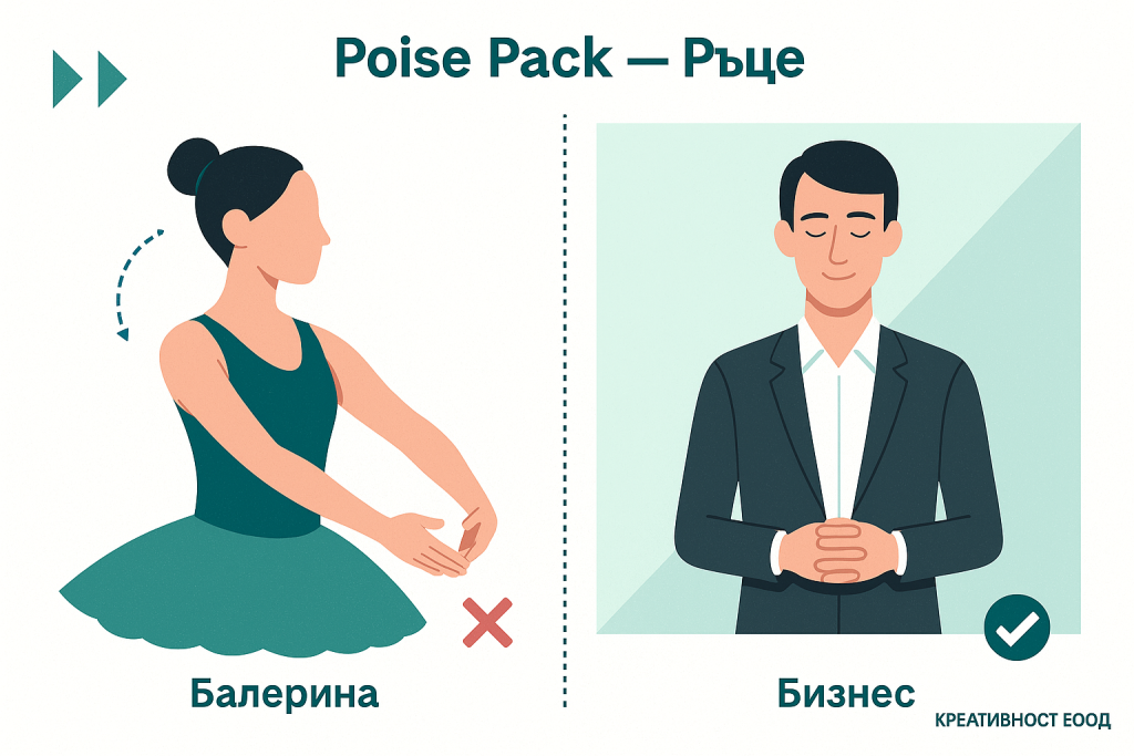 - Ляво: балетна поза, маркирани грешки в бизнес контекст (✖ свити рамене, ✖ висок блясък).