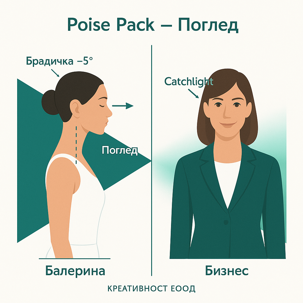 ALT текстове (пример): „Диптих балерина/бизнес: коригирана брадичка, отворени рамене, по-мек key light“.